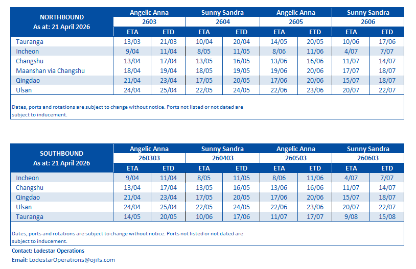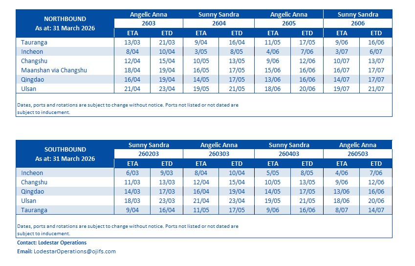 Lodestar operates in the break bulk market, generally servicing the north Asian markets of South Korea and China. Export cargos from New Zealand are generally forest products (wood pulp, kraft linerboard, lumber and logs) - for OjiFS and other exporters.
